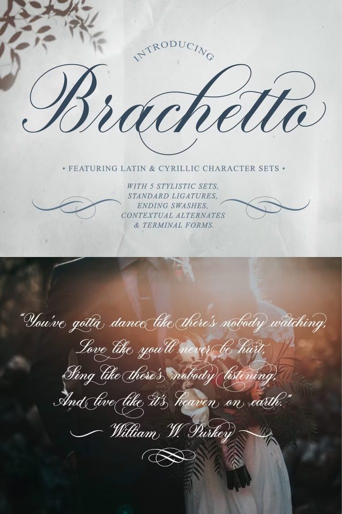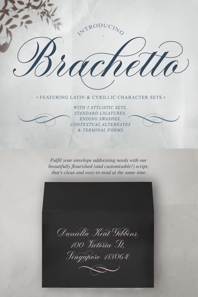 Brachetto is a calligraphy script font, influenced by traditional script style with an added touch of modernity and flourished elegance. It features a diverse range of stylistic alternates, contextual alternates, standard ligatures and terminal forms, and ensures countless options for you to choose from for your design work. This font is delicately crafted and well thought out with every little detail in mind, to ensure its ease and versatility when used.