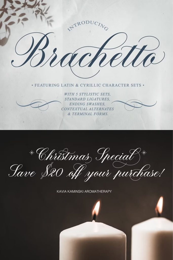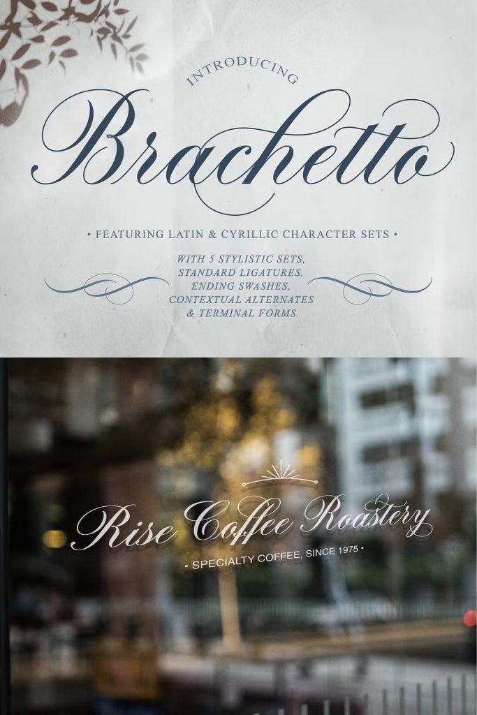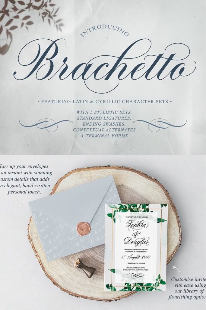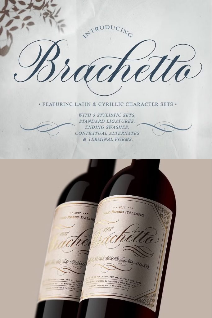 Being elegant yet bold in its visual presence, Brachetto is perfect for premium packaging, stationery design, invitations, posters, logos, custom products, lifestyle imagery and more; or essentially, anything that needs an upscale and premium lift. Other than the standard Latin set, Brachetto proudly features the Cyrillic alphabet, along with its corresponding stylistic alternates, for those in Russia and Ukraine.