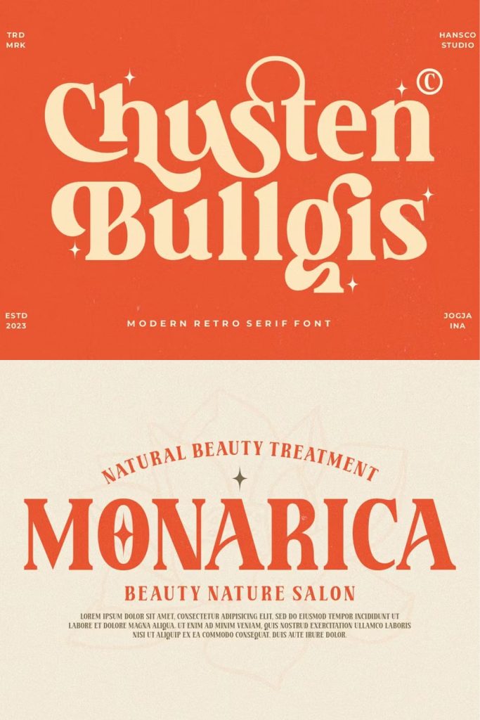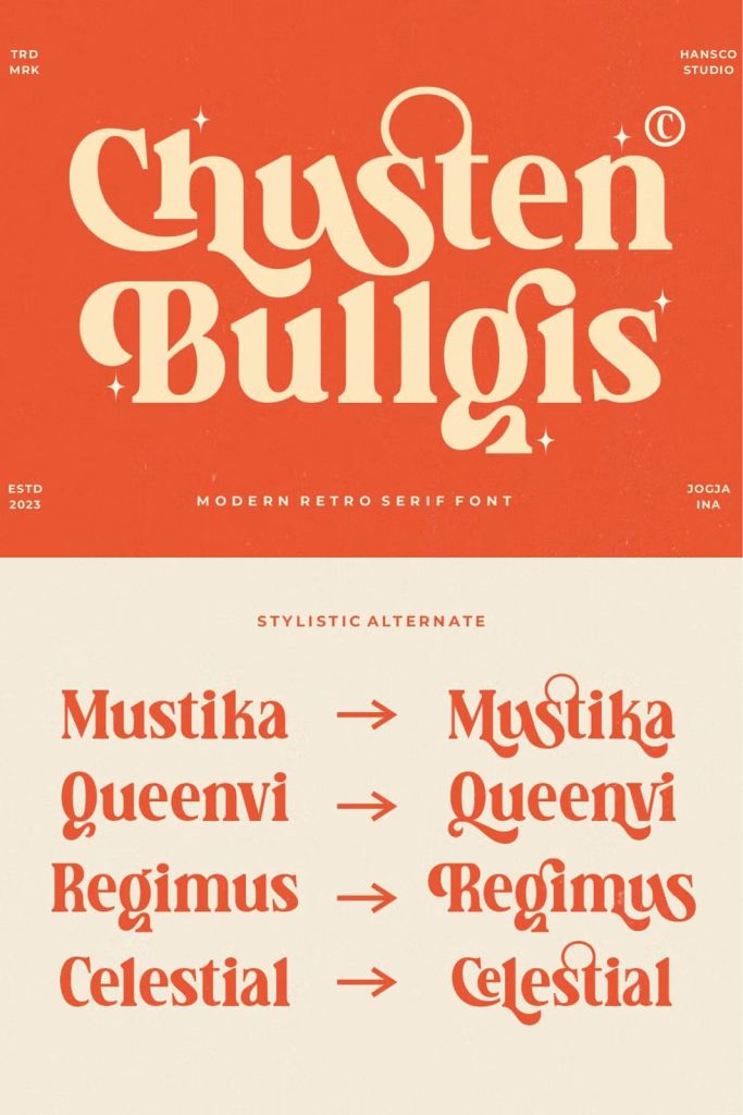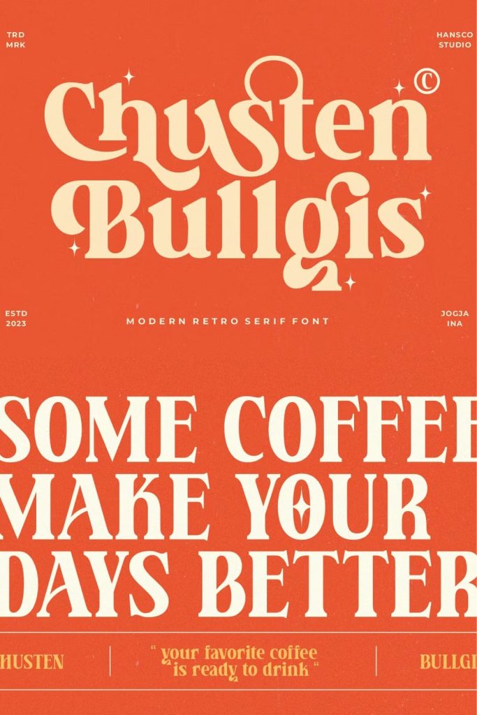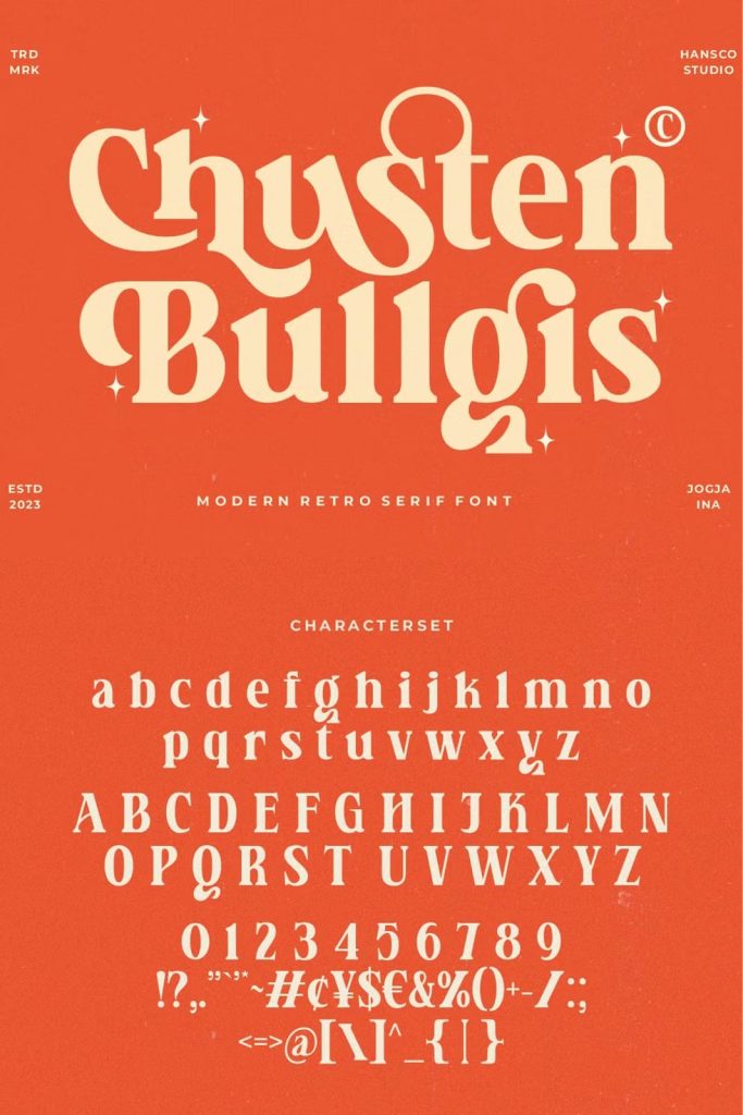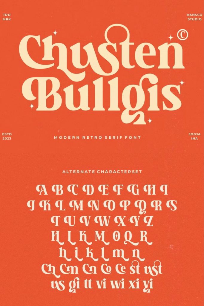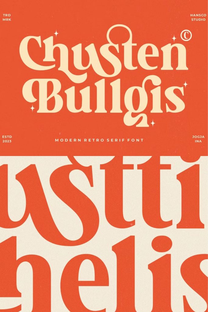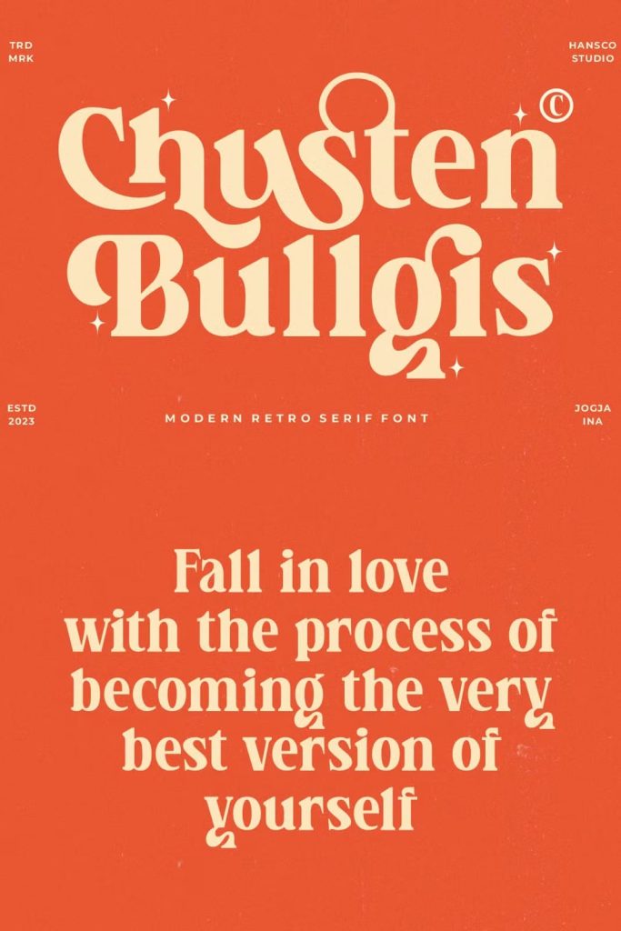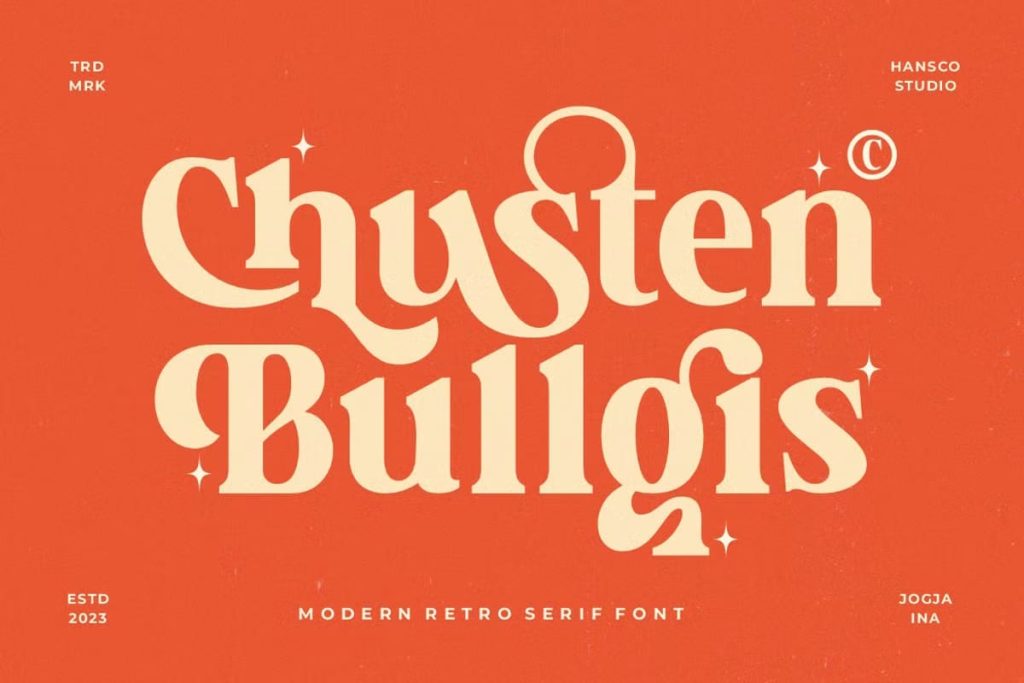 Chusten Bullgis feels playfully nostalgic and delivers an incredible retro vintage aesthetic font. Use this retro serif font to add that special retro touch to any design idea you can think of!