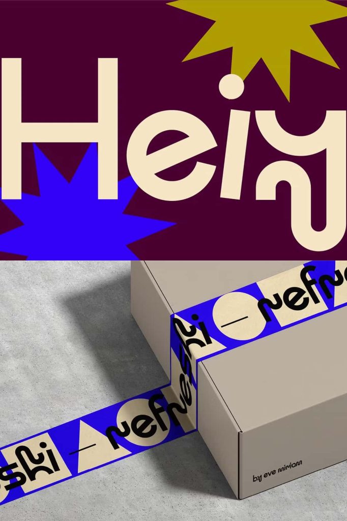 Designers can actively use Heiy to build branding systems that feel cohesive and engaging. Its unique character ensures that every element of the design contributes to a recognizable and impactful brand presence.