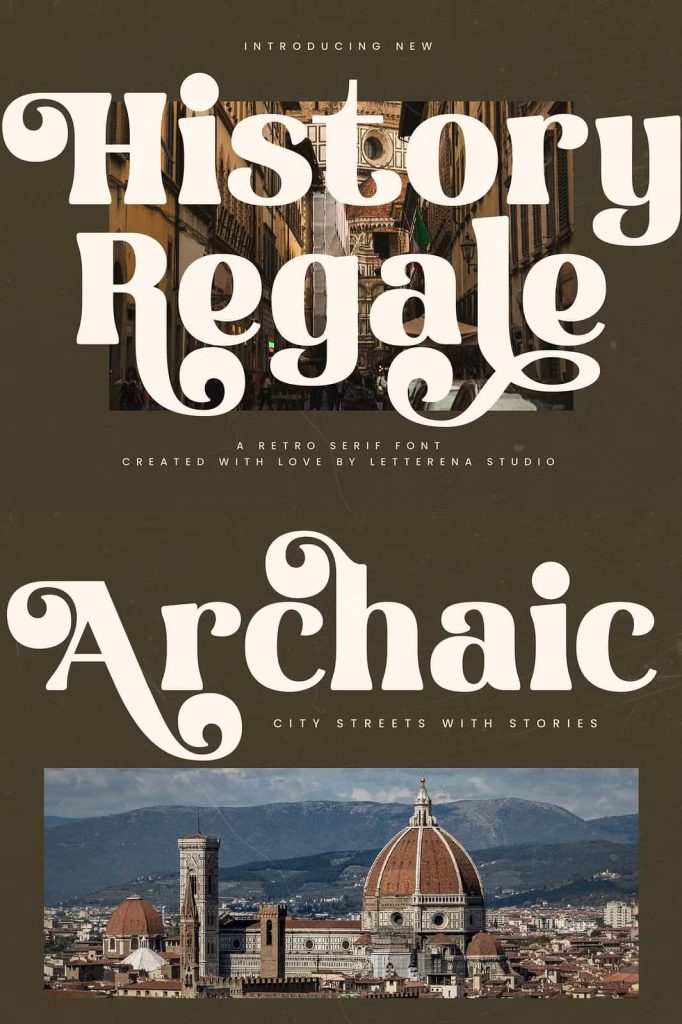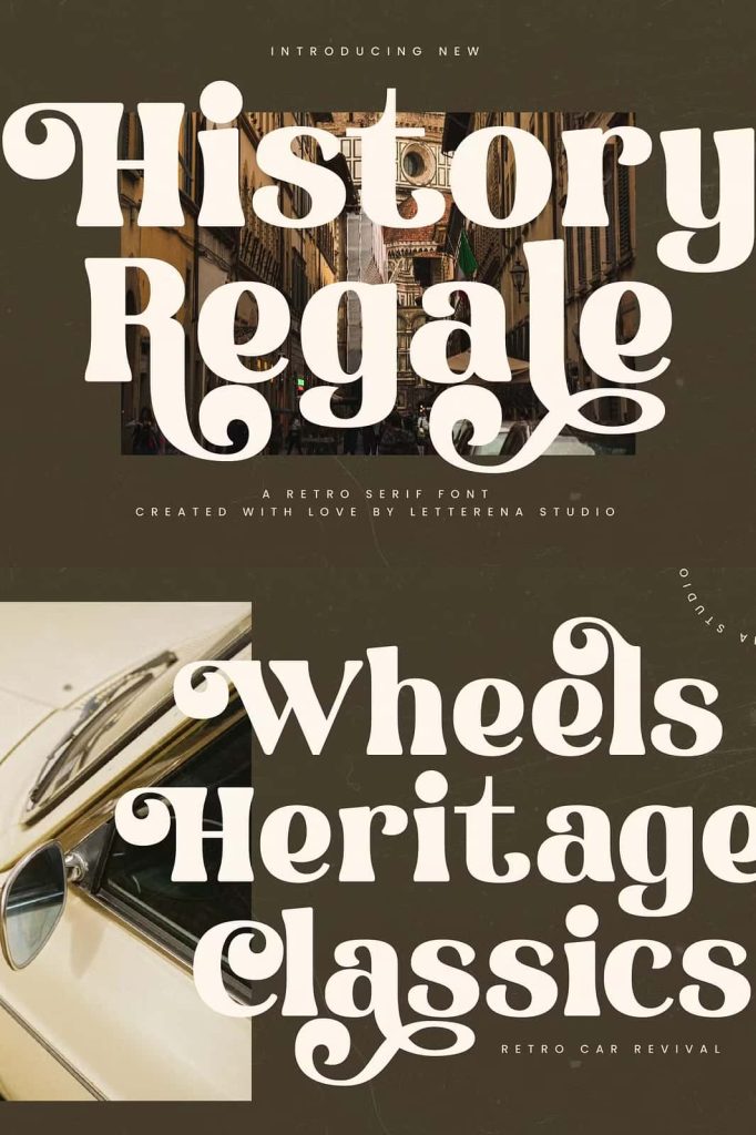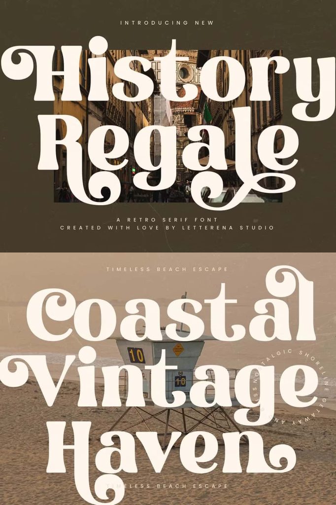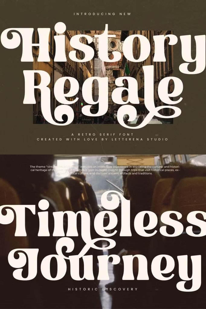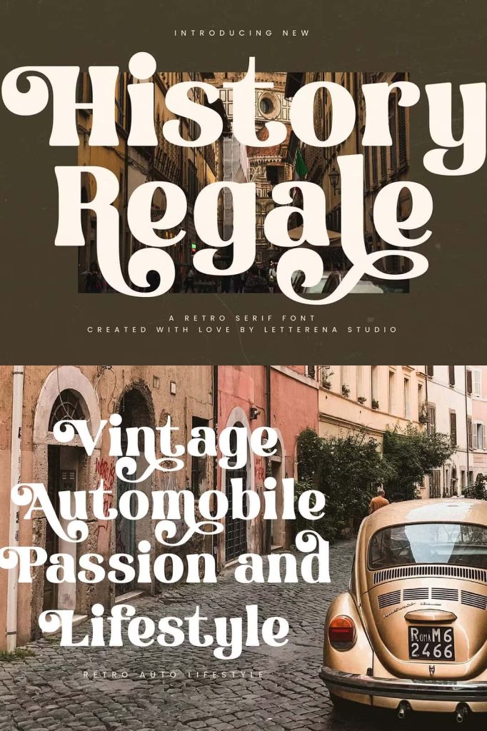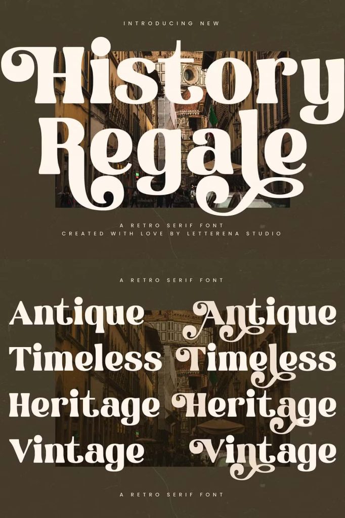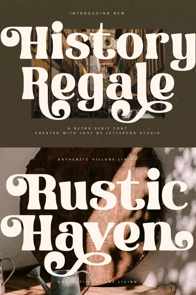 History Regale – Retro Serif Font , from Letterena, is a Luxury Serif font, suitable for any projects such as: logos, branding projects, homeware designs, product packaging, mugs, quotes, posters, shopping bags, t-shirts, book covers, name card, invitation cards, greeting cards, label, photography, watermark, special events, and all your other luxury and beautiful projects that need a Luxury Serif taste.