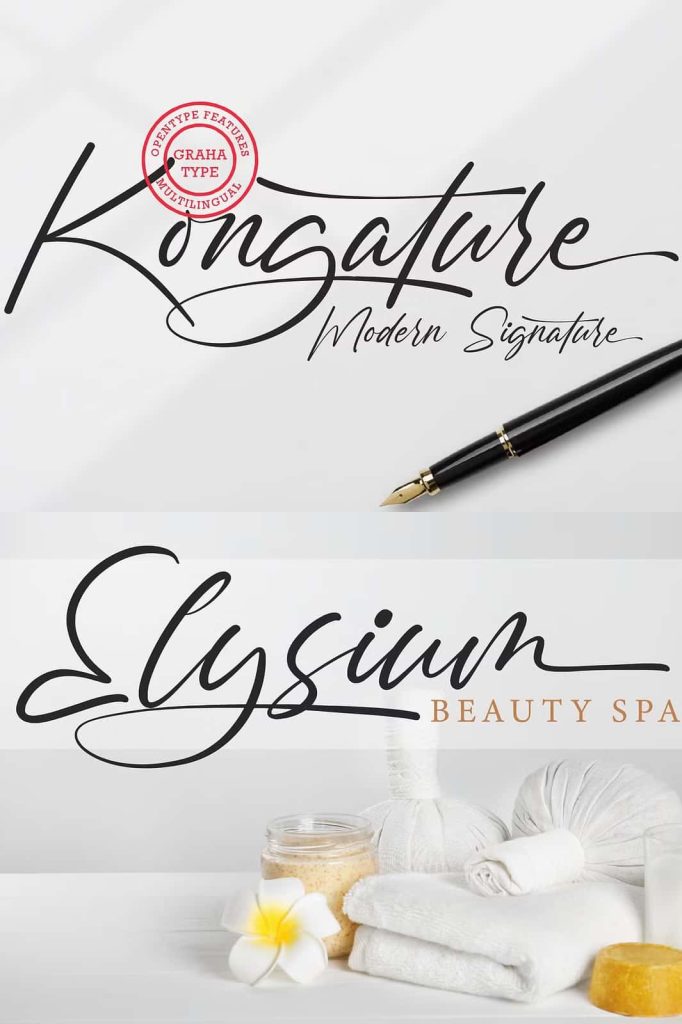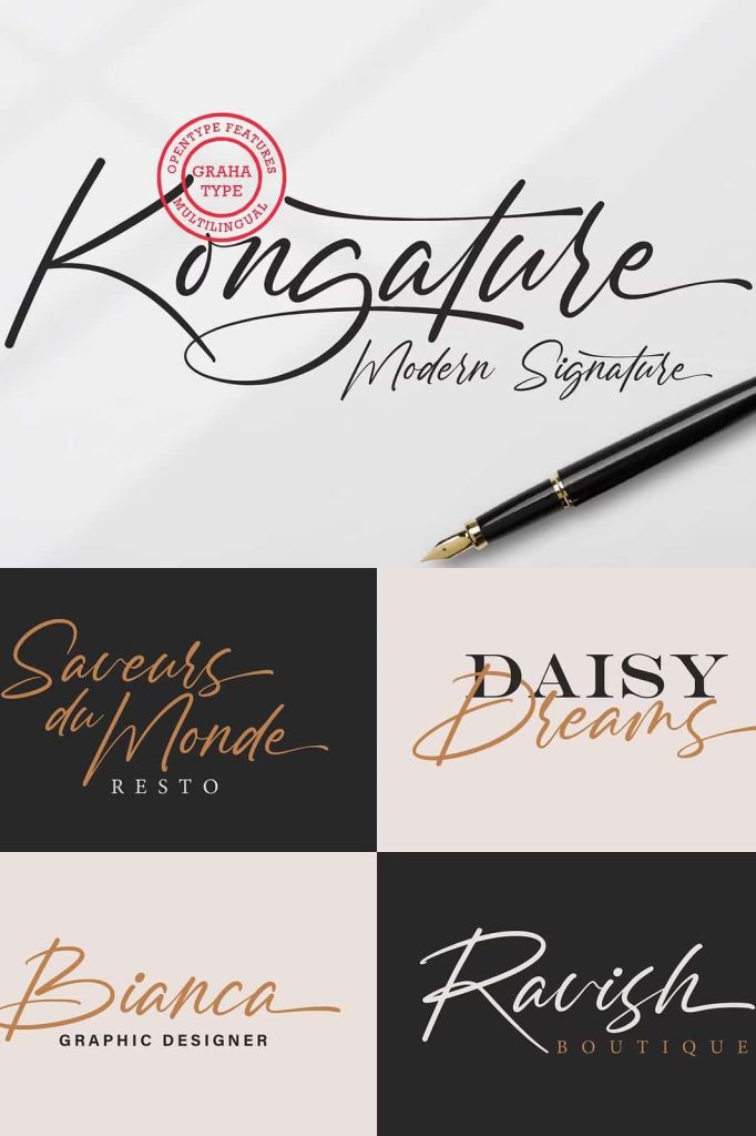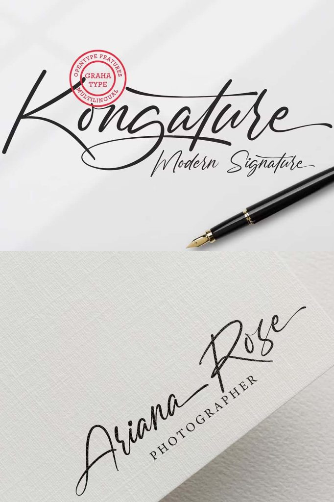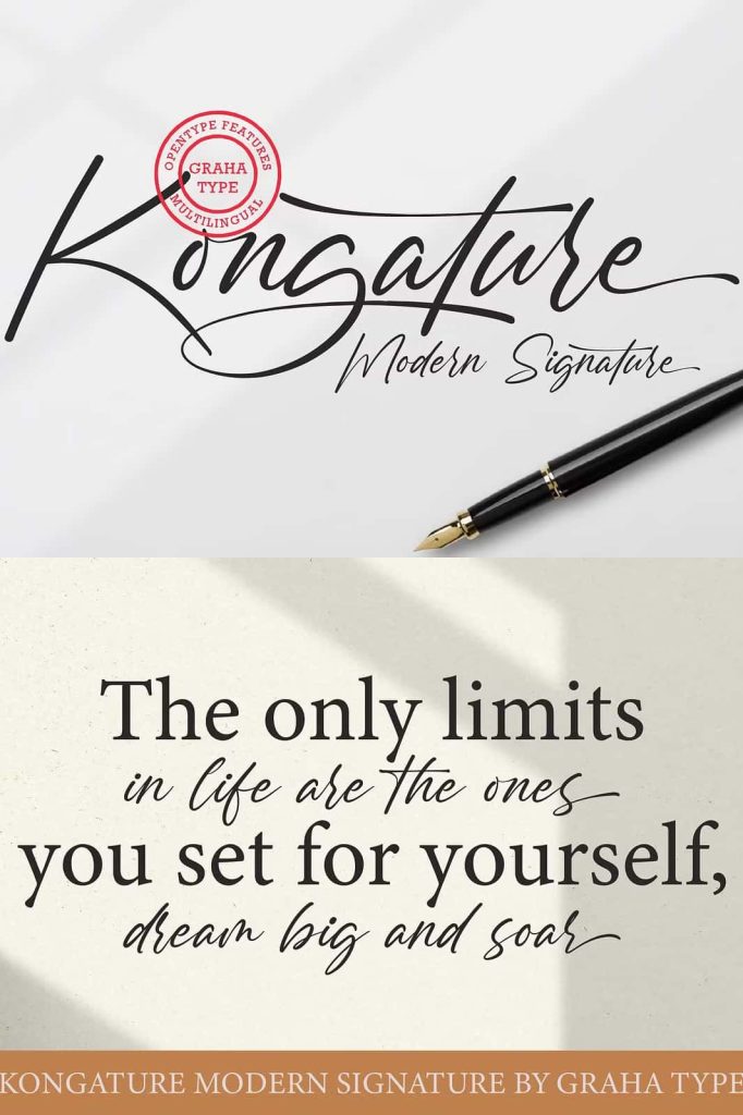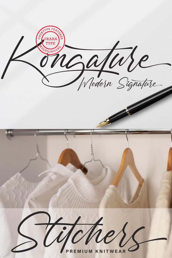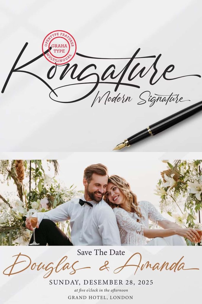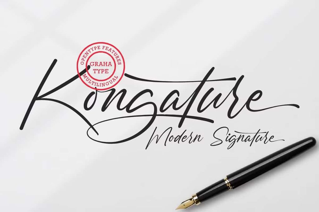 Kongature is a modern signature font that exudes a stylish and unique flair with every stroke. Its dynamic design and free flowing curves create a fresh and contemporary feel. Perfect for a variety of design needs, from invitations to branding, Kongature adds an elegant personal touch. Despite its strong character, the font maintains excellent readability, making it an ideal choice for headlines or logos.