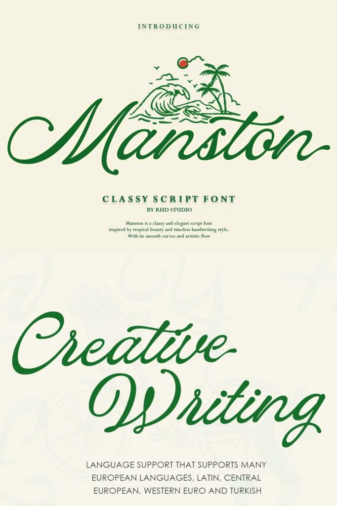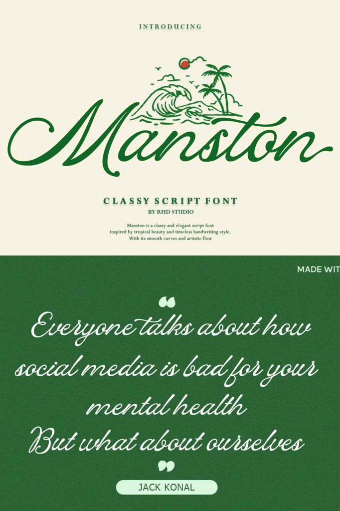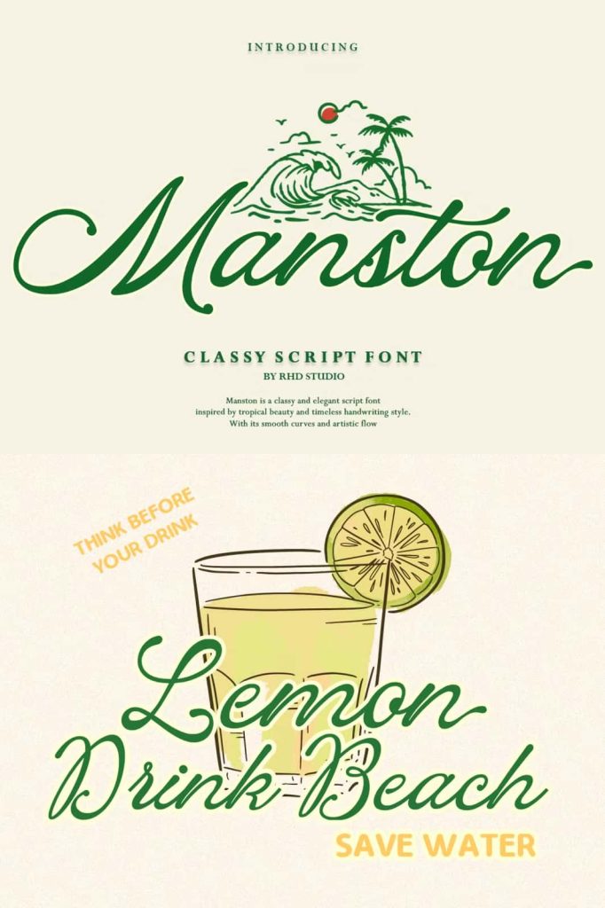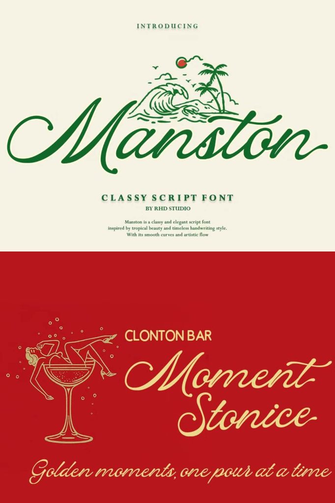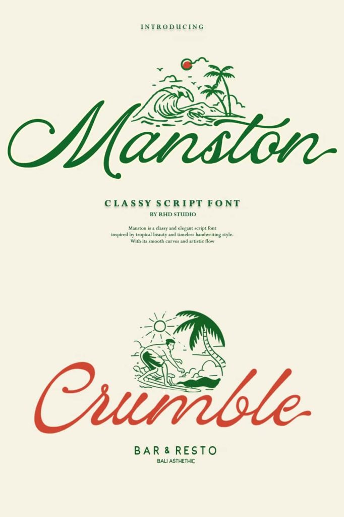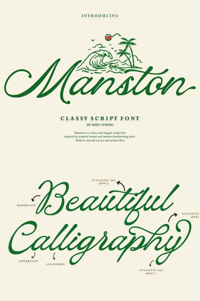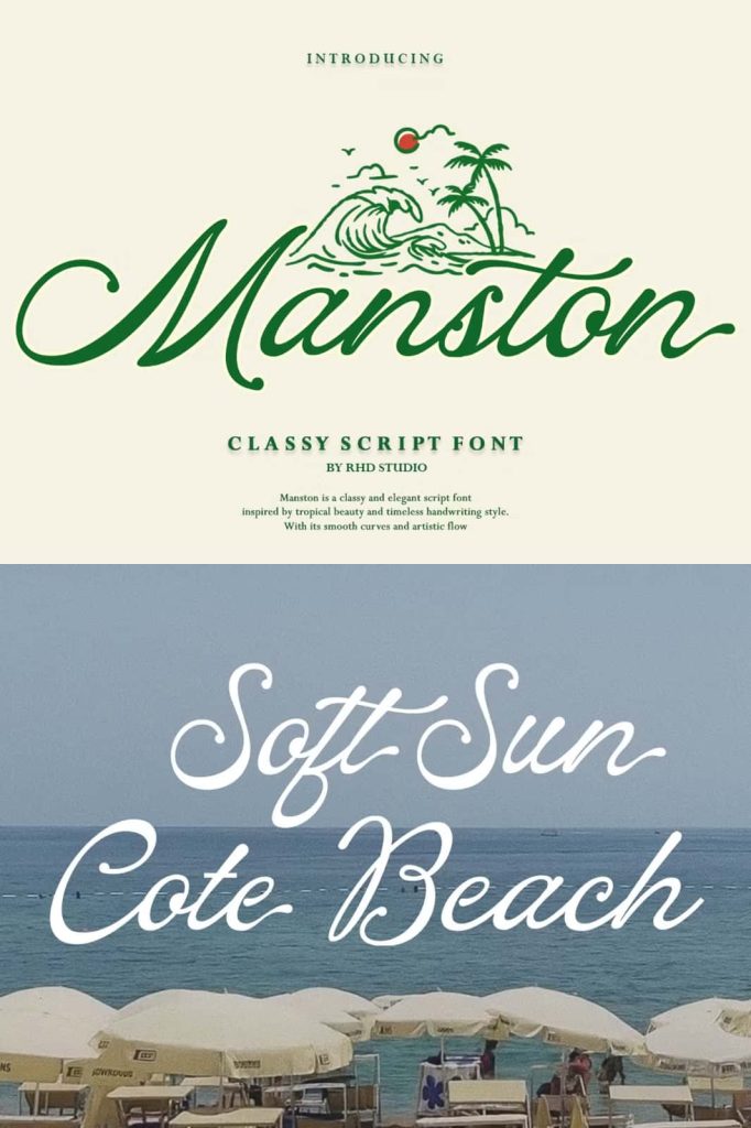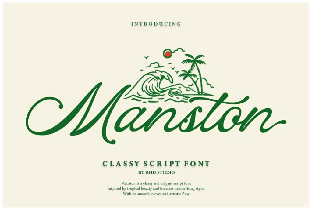 Manston – Classy Script Font Manston is an elegant script font infused with a captivating tropical vibe. Inspired by the beauty of beaches, the rhythm of ocean waves, and the spirit of endless vacations
