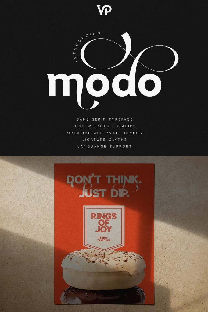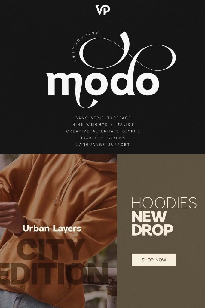 Modo is a contemporary sans serif typeface designed to balance clean minimalism with expressive creative flair. Featuring nine weights with matching italics, Modo adapts seamlessly from elegant thin lines to powerful bold statements.