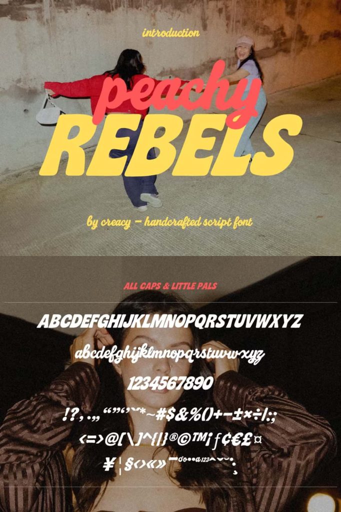 Peachy Rebels stands out by blending two distinct styles into one cohesive font system. The uppercase sans serif commands attention with its bold structure, clean lines, and confident presence. It creates strong headlines and powerful statements that immediately draw the viewer’s eye.