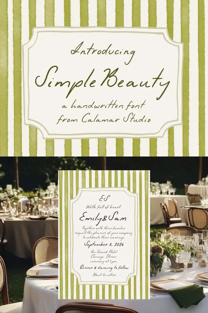 With Simple Beauty, invitations become more than just informational pieces. The font adds character and charm, helping designs stand out while maintaining a refined and elegant look. It allows designers to highlight important details while preserving a soft and welcoming tone.