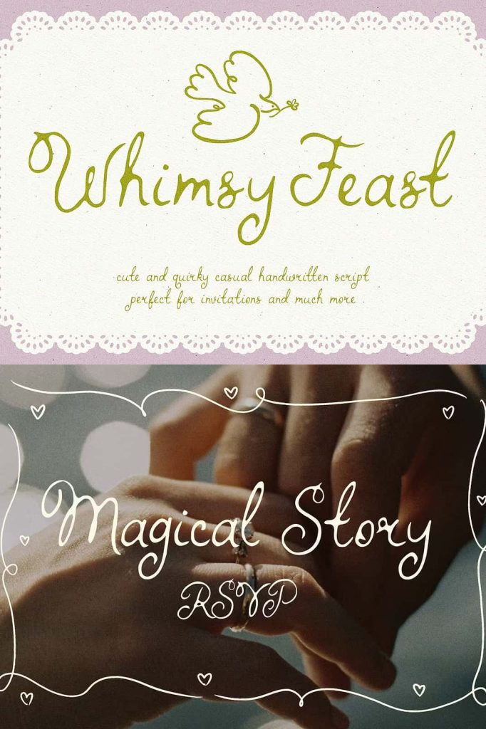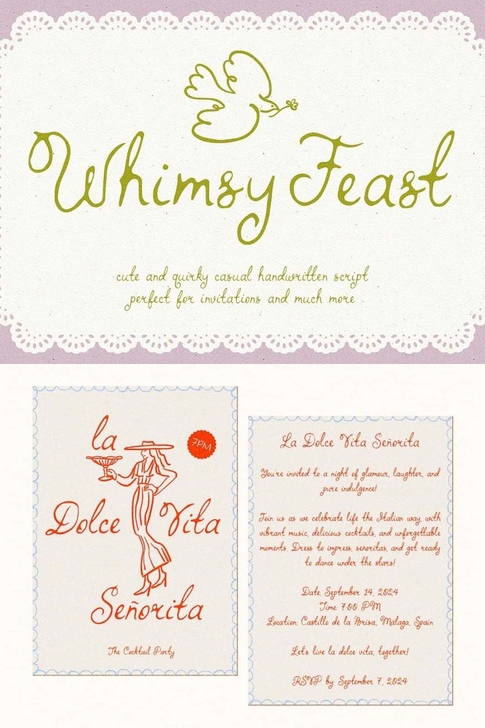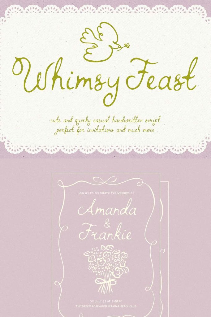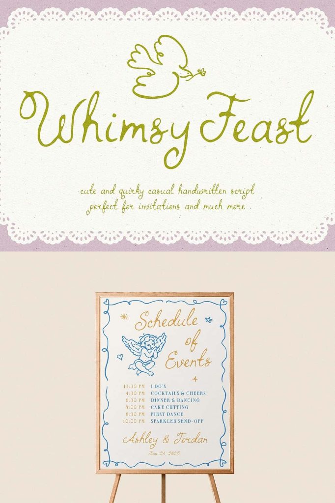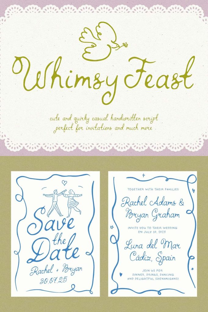 Whimsy Feast is a fully hand-drawn font, perfect for adding a unique and whimsical touch to your invitations, menus and much more. Every letter is crafted with care, making it an ideal choice for weddings, parties, and any event where you want your stationery to stand out. Whimsy Feast is a great choice for the 2024-2025 Wedding Season.